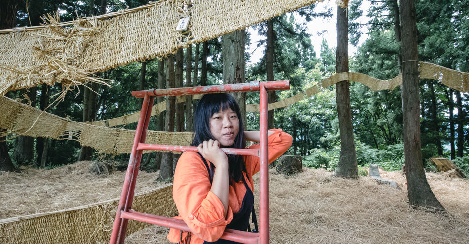 由於稻草堆中可能藏有昆蟲等各種小生物,基於安全考量,無法空運台灣的稻草到日本。這次作品的稻草原料皆由當地居民熱心提供,以車運送到我們工作的中津小學。